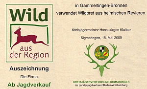 | Fritz | Birgit | Gammertingen | Wildfleisch und Erzeugnisse aus Wildfleisch z.B. Wurst in Gläsern; Enten, Gänse und Frischgeflügel von Kleinerzeugern aus der Region |  | www.wildkammer-laucherttal.de |